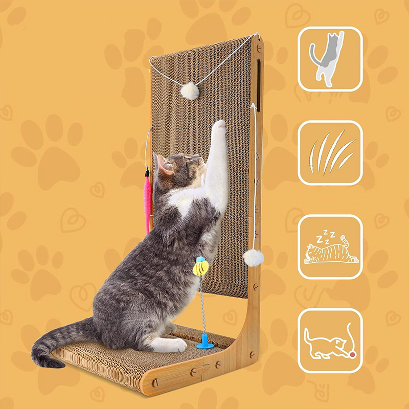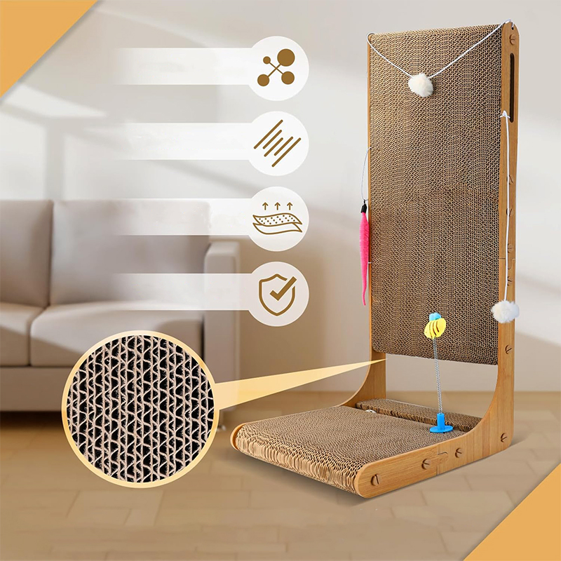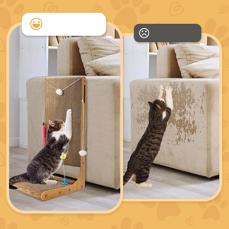 This cat scratching board is carefully made of environmentally friendly and non-toxic corrugated paper, providing a safe space for cats to play. With a thickness of 1.9 inches, it provides ample space for scratching, playing and resting, stimulating the natural instincts of cats. The innovative L-shaped design not only saves space, but also protects the wall and prevents scratching furniture. At the same time, the scratching board is also equipped with a variety of interesting toys, providing endless fun for cats. The four non-slip pads at the bottom ensure its stability, bringing peace of mind and a happy experience to you and your cat.